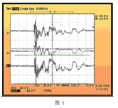 另一個要了解的重要因素是 CDE 波形,因為它不像以前討論的任何威脅,取決于耦合機制,要么是異模,要么是共模。此外,初步研究顯示,它在特點上有很大差異,但總體上看,CDE 的波形能量高,體現在電壓和電流驅動上。波形傳播的時間為幾百納秒,能夠快速反轉極性。下面的圖 5,給出了破壞性 CDE 波形的例子,在一個以太網 PHY 發射器引腳,一個 25 英尺雙絞線電纜靜電電壓達 1.5KV。在該事件發生超過 600ns 時間的期間,在異模波形上看到有 64.8V 從正電壓轉換為負電壓。在這個實驗中,PHY 的發射器被破壞,無法在網絡上傳輸數據包。