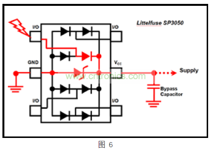 通過連接 SP3050的 VCC 引腳,由于電氣瞬態兩個獨立的放電路徑,如下(圖 6)紅色所示,設計者將更好進行夾緊設計。可以簡單地將它看作一個電阻分壓器,其中瞬態電流通過導向二極管,并選擇了兩條路,一個通過內部 TVS到 GND,一個通過電源或外部旁路電容到 GND??偠灾?,第 5 腳連接到電源,將導致更好的夾緊性能,給以太網 PHY 提供更好的整體保護。