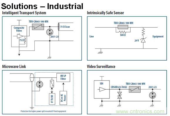 工業應用包含單線或雙線的保護,同樣非常簡單,TBU加一個氣體管,再加一個非常小的TBS。在這里加上TBU管有什么好處呢?因為TBS反應速度非常快,可以很快反應,TBU很快就會打通,在打通之后,打開之后所有的線路的過流和高壓都會阻絕在外面。
