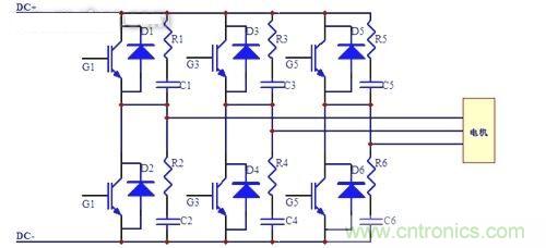 在集電極和發射極之間并接RC濾波電路,可有效地抑制關斷過電壓和開關損耗。但在實際應用中,由于DC電源前端的浪涌突波會使集電極過電壓,并使RC濾波電路部分的抑制效果生效,IGBT通常都會被擊穿或者短路。另外,在電機起動時,由于起動時的大電流,在主線路中分布的電感亦會造成較大程度的感應過電壓,使IGBT損壞。同時,電機勵磁造成的感應電動勢,對電路的破壞也相當地大——工程師們經常沒有考慮到這一點。