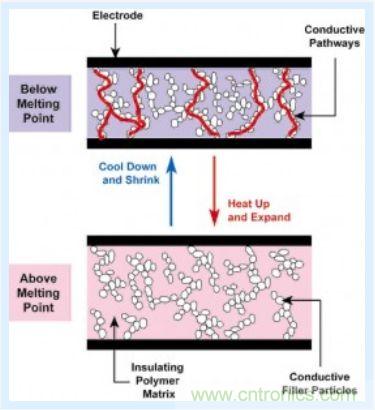 這是 PPTC 器件的工作原理,PPTC 器件是由一個(gè)由專業(yè)配方塑料和導(dǎo)電粒子混合而成的導(dǎo)電聚合物,如下圖所示,在正常溫度下,PPTC 器件中的導(dǎo)電粒子在聚合物中形成了低阻抗鏈。然而,如果溫度上升到器件的開關(guān)溫度之上,聚合物中的微晶體就會(huì)熔化而成為無(wú)定形狀態(tài)。晶體熔化過(guò)程中,體積會(huì)增加,引起導(dǎo)電粒子的分離,從而導(dǎo)致器件電阻呈現(xiàn)非線性增加。