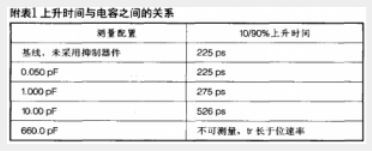 通常,USB 2.0 支持 480Mbps (bits per second) 的數據傳輸;DVI 和 HDMI 協議更是分別支持高達 8Gbps 和 5Gbps 的數據傳輸帶寬。在 USB 2.0、DVI 和 HDMI 的高速數據率下,傳統保護裝置的寄生電容可能破壞信號的完整性或令其失真。失真表現為由較慢的上升和下降時間所致的高態/低態瞬變的前沿和后沿被修圓。上升和下降時間較慢會給系統帶來一些問題,其中最重要的是時序問題。電路在特定的時間需要穩定的“高”態和“低”態。隨著各狀態之間過渡時間的增加,電路有可能檢測到不完整的過渡期,從而將數據誤差引入系統。附表1是不同寄生電容 ESD 抑制器件對數據上升沿時間 (10%至90%高電平) 所造成的影響比較。