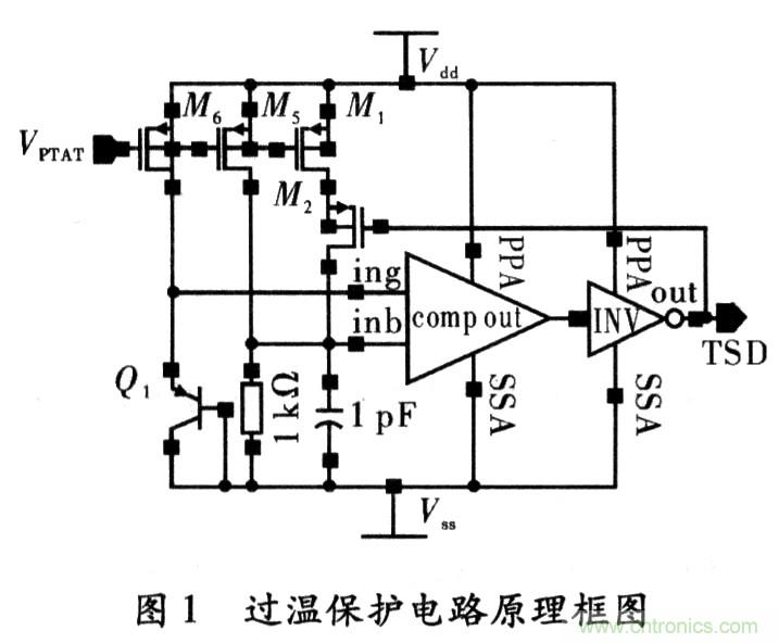圖1為本設計的原理架構,Q1為NWELLCMOS工藝中寄生PNP三極管,其集電極是必須與地點位連接,為了利用寄生PN結導通正向導通電壓的負溫度特性,把Q1做二極管連接(基集也接到地),這樣A點和地之間的電壓VA就具有了PN結正向電壓的與溫度成反比的性質。由于基準電路輸出的偏置電壓加在M0、M1、M5的柵極上,則其所在支路上都會產生PTAT電流(Proportional to Abso-lute Temperature);在提供偏置的同時,也在電阻R0上產生了與溫度成正比的電壓VB即B點電壓隨之增大。當達到某一溫度TH(設定的關斷溫度)后,VH≥VA、比較器Comp輸出高電平,經過倒相器INV后,輸出TSD為低電平;此信號作用于電路的其它模塊后,使整個芯片停止工作,實現熱保護功能。同時,TSD信號正反饋作用于M2柵上,開啟M2,加大了電阻R0上電流,使VB更高。