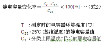 (2) 另一種是在公共標(biāo)準(zhǔn)中被歸類于Class2(種類2)的高介電常數(shù)獨石陶瓷電容器,使用了鈦酸鋇系的介電質(zhì)材料,其靜電容量值對溫度呈現(xiàn)出不規(guī)則的變化。 因此,靜電容量-溫度特性的標(biāo)準(zhǔn)值是針對基準(zhǔn)溫度(此處以25℃為基準(zhǔn))的靜電容量值C25,通過適用溫度范圍內(nèi)的靜電容量變化率的最大值與最小值進行規(guī) 定。(參照式2)。