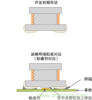 在 生產(chǎn)第一代LQN5N及第二代LQH32M時(shí),雖會(huì)對(duì)部分混合IC基板進(jìn)行回流焊接,但一般是對(duì)裝有插腳零部件的基板背面進(jìn)行波峰焊接。其貼裝方法是將膠 粘劑涂在基板焊盤的中央部或貼片元件電極的中央部,待其固化后將其投入波峰焊接槽。與CR貼片元件相比,體積較大的LQH系列在受到焊錫流動(dòng)阻力后易發(fā)生 脫落,因此在電極間中央部位設(shè)計(jì)了突起(稱為梯級(jí)磁芯)。現(xiàn)在看來的話,是反向支架形狀。至今再也見不到這種結(jié)構(gòu)。