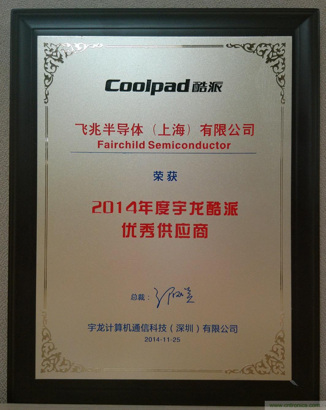 最佳供應(yīng)商獎旨在表彰Fairchild為宇龍酷派品牌提供一流產(chǎn)品、杰出服務(wù)和強大的技術(shù)支持。宇龍酷派品牌是中國領(lǐng)先的智能手機之一。Fairchild的準時交貨為 2014 上半年宇龍大舉進軍 4G LTE 智能手機市場提供了大力支持。