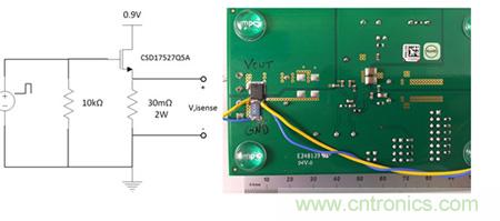大多數電源評估模塊可以很容易地被配置為快速汲入電流的模式。圖1舉例說明了分立金屬氧化物半導體場效應晶體管(MOSFET)加可直接從輸出平面焊接到接地裝置的檢測電阻器電路。選擇快速切換的低柵極電荷MOSFET以及能處理負載功率的低電感檢測電阻器至關重要。