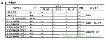 也許你還注意到了上面有許多關于時間的標注,這也是個十分重要的信息,這些時間的標注表明了某些狀態所要維持的最短或最長時間。因為器件的工作速度也是有限的,一般都跟不上主控芯片的速度,所以它們直接之間要有時序配合。話說現在各種處理器的主頻也是瘋狂增長,日后搞不好出現個雙核單片機也不一定就是夢話。下面是時序參數表: