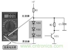 檢測這一電路中的3只二極管最為有效的方法是測量二極管上的直流電壓,如圖9-41所示是測量時接線示意圖。如果測量直流電壓結(jié)果是1.8V左右,說明3只二極管工作正常;如果測量直流電壓結(jié)果是0V,要測量直流工作電壓+V是否正常和電阻R1是否開路,與3只二極管無關(guān),因為3只二極管同時擊穿的可能性較小;如果測量直流電壓結(jié)果大于1.8V,檢查3只二極管中有一只開路故障。