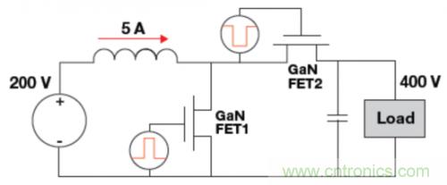 器件應力由使用圖2中所示拓撲的升壓轉換器顯示。圖3中顯示的是初級側開關 (FET1) 上硬開關接通變換的仿真結果。輸入電壓為200V,而電感器電流為5A(負載電流大約為2.5A)。在這個情況下,當FET1關閉時,由于鉗制FET (FET2) 導電,它的漏電壓大約鉗制在400V。因此,當FET1接通時,它需要在Vds開始下降之前灌入整個電感器電流(區域A)。