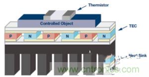 熱電冷卻器包括兩片表面陶瓷板,其間交替放置P型和N型半導體陣列,如圖2所示。