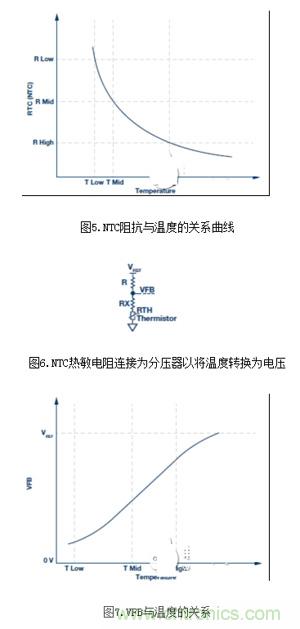 圖5顯示了負溫度系數(NTC)熱敏電阻在溫度范圍內的阻抗。由于它與溫度具有相關性,因此可將其連接為分壓器,從而將溫度轉換為電壓。典型連接如圖6所示。當RTH隨溫度而變化時,VFB也會變化。增加一個Rx與熱敏電阻串聯,便可相對于VREF將溫度電壓傳遞函數線性化,如圖7所示。必須將其與模塊殼內部的激光器緊密耦合,隔絕外部溫度波動影響,使其能精確檢測溫度。