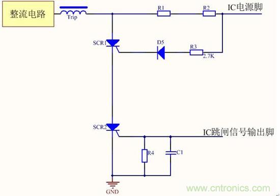 斷路器三相同時通電時,經過全橋整流之后加在可控硅兩端的直流電壓超過500V,對單個可控硅的參數要求非常高,目前主流產品都是采用雙硅串聯的電路,以此降低單個可控硅兩端的直流電壓,提高可控硅觸發電路的可靠性和穩定性。現有技術采用的雙硅串聯電路如下圖所示,只是簡單的把兩個可控硅串聯起來,當漏電IC芯片檢測到漏電信號達到跳閘閾值時,跳閘信號輸出引腳輸出高電平,可控硅SCR2觸發,繼而可控硅SCR1觸發,從而使得漏電斷路器線圈脫扣。