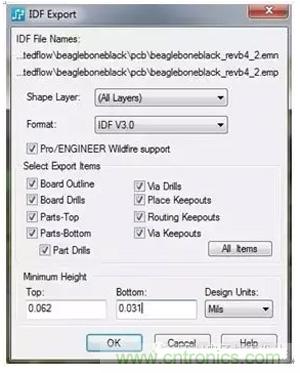 系統需要能夠以與 DXF 參數設置類似的方式,來控制 IDF 文件中將包含的內容,如圖 6 中所示。如果某些元器件沒有高度信息,IDF 導出能夠在創建過程中添加缺少的信息。