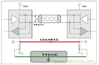 干擾不但影響信號,更嚴(yán)重的會導(dǎo)致板子死機(jī)或者燒毀,所以接口和電源的隔離是抗干擾的第一條“軍規(guī)”.隔離的主要目的是:避免地回流燒毀電路板和限制干擾的幅度,保護(hù)控制器不死機(jī)。如圖3所示,為未隔離時(shí),兩個(gè)節(jié)點(diǎn)的地電位不一致,導(dǎo)致有回流電流,產(chǎn)生共模信號,CAN的抗共模干擾能力是-12~7V,超過這個(gè)差值則出現(xiàn)錯(cuò)誤,如果共模差超過±36V,燒毀收發(fā)器或者電路板。