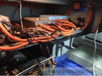 遠(yuǎn)離干擾源是最簡單的抗干擾方法,如果CAN線與強(qiáng)電干擾源遠(yuǎn)離0.5米,干擾就基本影響不到了。可是在實(shí)際布線中,經(jīng)常遇到空間太小而不得不和強(qiáng)電混在一起,如圖12所示,為某新能源汽車的驅(qū)動(dòng)系統(tǒng),CAN線與驅(qū)動(dòng)線混在一起,結(jié)果導(dǎo)致干擾很大。只要與CAN并行的驅(qū)動(dòng)線,具備2A/秒的電流變化,就會耦合出強(qiáng)磁場而導(dǎo)致CAN線上出現(xiàn)干擾脈沖。所以CAN線必須要和電流會劇烈變化的線纜遠(yuǎn)離。比如繼電器、電磁閥、逆變器、電機(jī)驅(qū)動(dòng)線等。