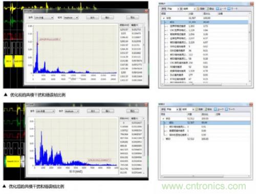 磁環(huán)的效果可以大大削減特定頻率的干擾強(qiáng)度,在增加磁環(huán)前,需要用CANScope或者示波器FFT快速傅里葉變化功能,測試出最高干擾的頻率,然后向磁環(huán)廠家定制對應(yīng)頻率的磁環(huán)。如圖14所示。為增加磁環(huán)前和增加磁環(huán)后的FFT的結(jié)果。可以看出干擾強(qiáng)度明顯減小。