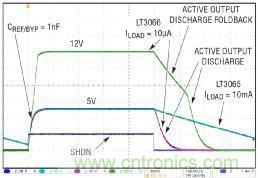 圖 2 顯示,具備主動輸出放電功能的 500mA LT3066 與類似的 LT3065 (500mA,沒有主動輸出放電功能) 相比的優(yōu)勢。