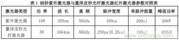 皮秒光纖激光器是在超快激光基礎(chǔ)上開發(fā)出的新一代激光器,尤其是近年來(lái)光纖器的研制成功,標(biāo)志著激光技術(shù)的一次飛躍進(jìn)步,與固體納秒激光相比,皮秒光纖激光器具有以下優(yōu)點(diǎn):1.激光脈沖寬度更窄,僅為 10^-12S,從上述材料吸收激光能量轉(zhuǎn)化為熱能的擴(kuò)散距離公式可知,這將大大減小激光加工材料時(shí)的熱擴(kuò)散距離,降低激光對(duì)材料的熱損傷;2.因脈沖寬度變窄,激光單脈沖峰值功率成倍增加,提升了激光加工材料的能力;3.光纖激光器以細(xì)小的光纖作為激光的傳輸和放大介質(zhì),與固體放大結(jié)構(gòu)相比,不僅工作穩(wěn)定,免除了周期性的調(diào)校工作,降低了維護(hù)成本,而且結(jié)構(gòu)小巧,制造成本相對(duì)較低。表1是量澤激光公司研制的光纖器與目前市面上主流的納秒級(jí)固體紫外激光器的參數(shù)對(duì)照: