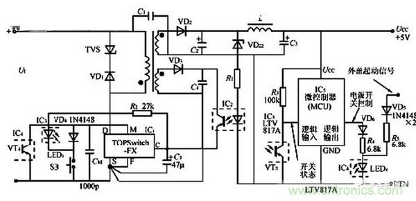 【導讀】開關電源部分主要由TOP Switch FX(IC1)、光耦合器(IC2)組成。控制電路則包括微控制器(MCU)、兩片LTV817A線性光耦合器(IC3、IC4)、按鈕開關SB。
