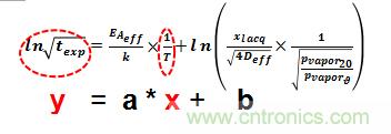 這個一般描述可解釋為直線函數 y = ax + b,其中 y 代表暴露時間 texp 的 ln√,x 代表 1/T(= 絕對溫度 T [開爾文] 的倒數),如圖 3 所示。