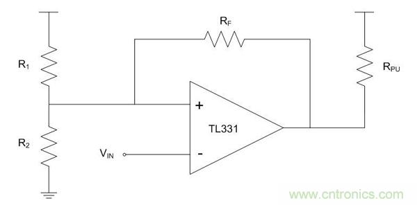 在這種配置中,當輸入信號低時,輸出拉低,導致非反相節(jié)點的電壓降到更低。一旦輸入信號足夠高,以拉動非反相節(jié)點高于參考電壓,輸出拉高,從而將非反相節(jié)點拉得更高。
