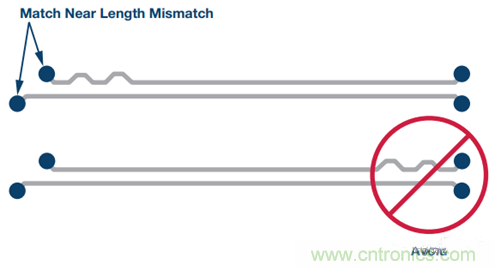 成對(duì)差分走線的長度須相同。此規(guī)則源自這一事實(shí):差分接收器檢測正負(fù)信號(hào)跨過彼此的點(diǎn),即交越點(diǎn)。因此,信號(hào)須同時(shí)到達(dá)接收器才能正常工作。