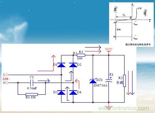 采用半波整流方式,根據計算式I1=0.5|I|=34500C可知,C=0.43uF。所以此處選用0.47uF的電容,反過來可以驗證提供的電流I1=34500C=16.2mA,多余電流從穩壓管流過。