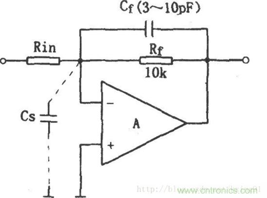 一般線性工作的放大器(即引入負反饋的放大電路)的輸入寄生電容Cs會影響電路的穩定性,其補償措施見圖。放大器的輸入端一般存在約幾皮法的寄生電容Cs,這個電容包括運放的輸入電容和布線分布電容,它與反饋電阻Rf組成一個滯后網絡,引起輸出電壓相位滯后,當輸入信號的頻率很高時,Cs的旁路作用使放大器的高頻響應變差,其頻帶的上限頻率約為: