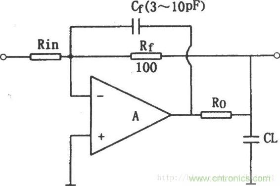 對于許多集成運算放大電路,若輸出負載電容CL的值比100pF大很多,由于輸出電容(包括寄生電容)與輸出電阻將造成附加相移,這個附加相移的累加就可能產生寄生振蕩,使放大器工作嚴重不穩定。解決這一問題的方法是在運放的輸出端串聯一個電阻Ro,使負載電容CL與放大電路相隔離,如圖所示,在Ro的后面接反饋電阻Rf,這樣可以補償直流衰減,加反饋電容Cf會降低高頻閉環電壓放大倍數,Cf的選取方法是:使放大電路在單位增益頻率fT時的容抗Xcf≤Rf/10,又Xf=l/(2πfTCf),一般情況下,Ro=50~200Ω,Cf約為3~10pF。