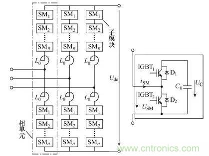 西門子公司為此設計了一種由多個子模塊串聯的模塊化多電平換流器(modular multilevel converter, MMC)。這種結構的換流器可以使全控型功率器件運行在較低的開關頻率,大大降低了電磁干擾和損耗;同時采用排序充放電電容的均壓策略,可以輕松實現數量龐大的級聯模塊的動態均壓;其模塊化結構,也便于安裝及日后的維護。因此,我國近幾年的柔直工程換流器均采用MMC結構。