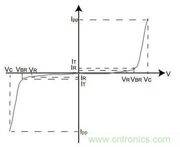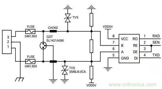 在智能儀表行業(yè)里一般采用RS-485通訊。下圖所示為RS-485通訊接口的典型應(yīng)用。在保護(hù)RS-485接口不被靜電或者浪涌損壞通常用SMBJ5.0CA來做接口保護(hù)如下圖3所示,當(dāng)靜電或者浪涌電壓高于5V時,SMBJ5.0CA會開始動作,將電壓鉗位在很低的位置,如果電流超過了峰值電流IPP話,最終電壓會被鉗位在9V左右,從而保護(hù)了后一級的器件不被損壞。