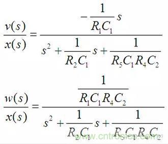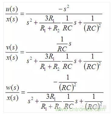 上面三個(gè)式子分別對應(yīng)高通、帶通和低通濾波器,如果將u、v、w三路信號加權(quán)疊加則可以組成任意的二階系統(tǒng)。
