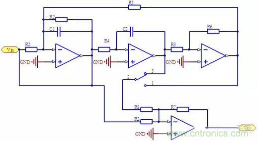 原始信號減去帶通信號就稱為帶阻信號了,因此再增加一個(gè)運(yùn)放就可以實(shí)現(xiàn)帶阻型濾波器。