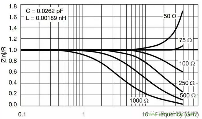 上圖電阻的高頻特性非常好,可以看到極間電容只有0.03pF,引線電感只有0.002nH,其中75Ω的電阻可以到30GHz。我們通常使用的貼片電阻大都是厚膜電阻,性能遠達不到如此,其引線電感有幾個nH,極間電容也有幾個pF,大多只能用到幾百MHz或幾個GHz。