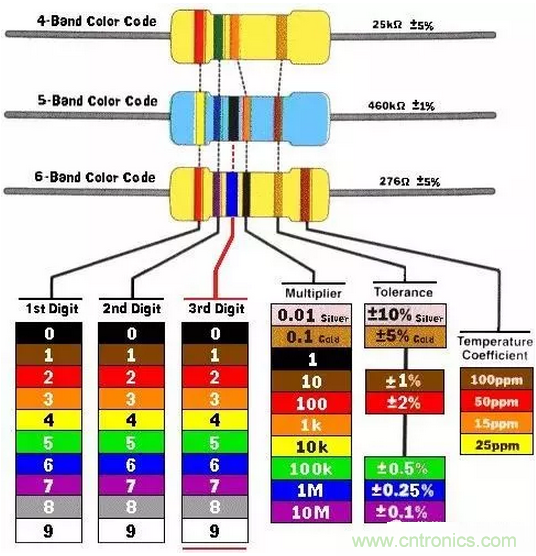 從左往右,前兩個或三個環代表數字,接下來的環代表乘數,與前面的數字相乘便是阻值。再接下來的環代表電阻的容差,最后就是電阻的溫度系數。