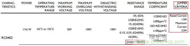 此時,就需要從電阻的規格書中獲取相關參數,從下圖可以看出RC0402的零歐姆電阻,其電阻值不會超過50mΩ,額定電流不超過1A,由此就可以判斷電阻是否滿足設計要求。通常0402的零歐姆電阻都可以滿足1A以下的電流要求。