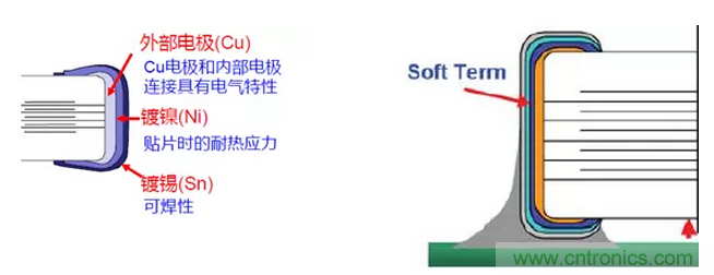 陶瓷電容主要由兩部分組成,陶瓷電容本體和外部電極組成。本體部分由內(nèi)部電極和介質(zhì)層組成,外部電極由銅鎳錫三層組成,柔性電容會在銅鎳之間多加一層Soft Term層,增加可靠性。