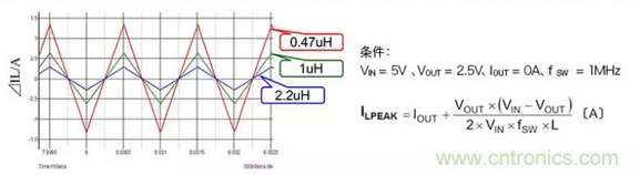 在這里,為加深對電感工作的理解,進一步說明電感值變化時電感電流如何變化的情形。下圖表示在相同工作條件下將電感值設為0.4μH、1μH、2.2μH時ILPEAK。