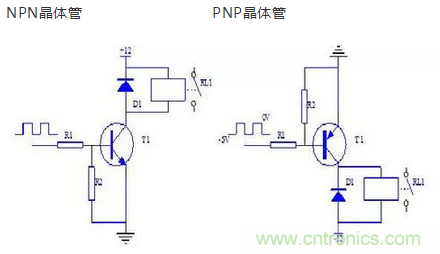 NPN晶體管驅(qū)動時:當(dāng)晶體管T1基極被輸入高電平時,晶體管飽和導(dǎo)通,集電極變?yōu)榈碗娖剑虼死^電器線圈通電,觸點RL1吸合。