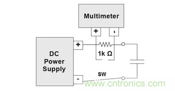 下面是通過使用電阻和內阻阻抗較高的萬用表來測量超級電容漏電流的步驟,以測試電路圖: