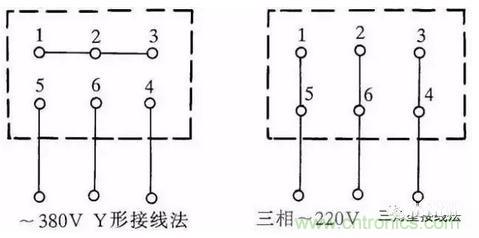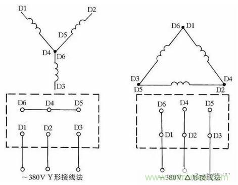 圖1:三相交流電動機Y形和△形接線方法