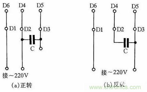 圖4是JX07A-4型單相電容運轉電動機接線方法。電動機功率為60W,用220V/50Hz交流電源、電流為0.5A。它的轉速為每分鐘1400轉。電容選用耐壓400~500V、容量8μF的產品。圖4(a)為正轉接線,圖4(b)為反轉接線。