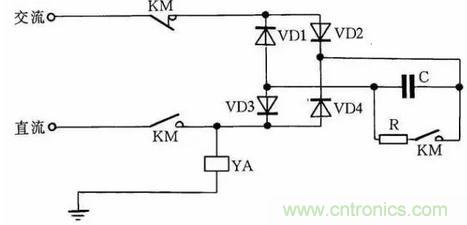 快速退磁的工作原理是:直流電磁鐵斷電后,交流電源通過橋式整流器和YA向電容C充電,隨著電容C兩端電壓的不斷升高,充電電流越來越小,而通過YA的電流又是交變的,從而使電磁鐵快速退磁。電容C的容量要根據電磁鐵的實際情況現(xiàn)場試驗決定。R為放電電阻。