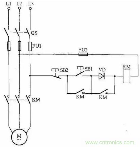 因為啟動電流較大,所以這種線路只適用于操作不頻繁的場合。線路中,VD應選用耐壓大于700V的二極管,電流要根據交流接觸器線圈電流而定。