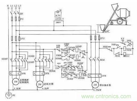 這時料斗已升到預定位置,把料自動倒到攪拌機內,并自動停止上升。此時操作人員按下下降按鈕2SBR時,卷揚系統(tǒng)帶動料斗下降,待下降到其料口與地面平齊時,擋鐵碰撞行程開關3SQ,使2KMR接觸器斷電釋放,自動停止下降,為下次上料做好準備,這時攪拌機料已備好,操作人員再按下3SB1,3KM接觸器得電吸合,使供水抽水泵電動機3M運轉,向攪拌機內供水,與此同時,時間繼電器KT得電工作,待供水與原料成比例后(供水時間由KT時間繼電器調整確定,根據原料與水的配比確定),KT動作延時結束,從而使3KM自動釋放,供水停止。