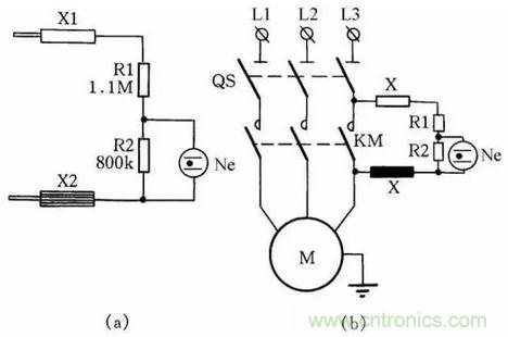 如果絕緣電阻合乎標準(即絕緣電阻值大于0.5MΩ),則泄漏電流很小時,在R2上的電壓降小于氖泡的點燃電壓,Ne不亮;當任意兩相或三相同時對機殼的絕緣電阻降低時,泄漏電流大增,使氖泡Ne點燃,從而可判定絕緣不合格。