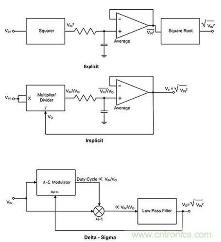 圖2:測量波形的RMS值有三種不同的方法:顯式、隱式和三角積分電路拓?fù)?。(圖片來源:Digi-KeyElectronics)