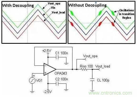 要回答這個問題,需要考證在不使用去耦器件時會出現(xiàn)什么問題。 圖 1 為帶去耦電容器和不帶去耦電容器(C1 和C2)情況下用于驅(qū)動 R-C 負載的緩沖電路。我們注意到,在不使用去耦電容器的情況下,電路的輸出信號包含高頻 (3.8MHz) 振蕩。對于沒有去耦電容器的放大器而言,通常會出現(xiàn)穩(wěn)定性低、瞬態(tài)響應(yīng)差、啟動出現(xiàn)故障以及其它多種異常問題。