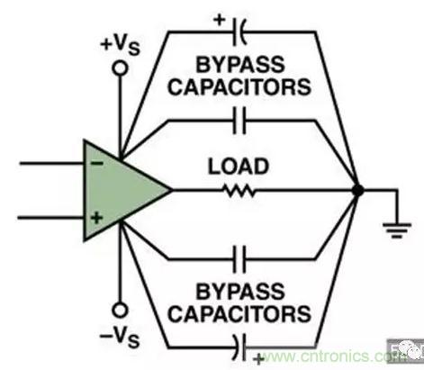 這種方法在大多數情況下都是最有效的,採用多個并聯電容器將運算放大器的電源引腳直接接地。一般說來兩個并聯電容就足夠了,但是增加并聯電容器可能給某些電路帶來益處。